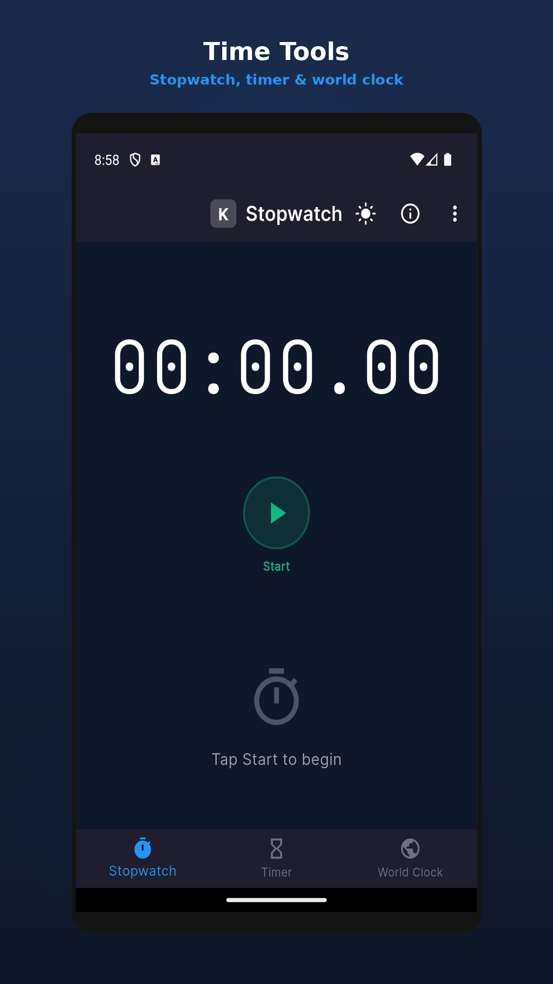 ToolsComplete time toolkit. Precision stopwatch with lap times, customizable countdown timers, and world clock showing time across cities worldwide.